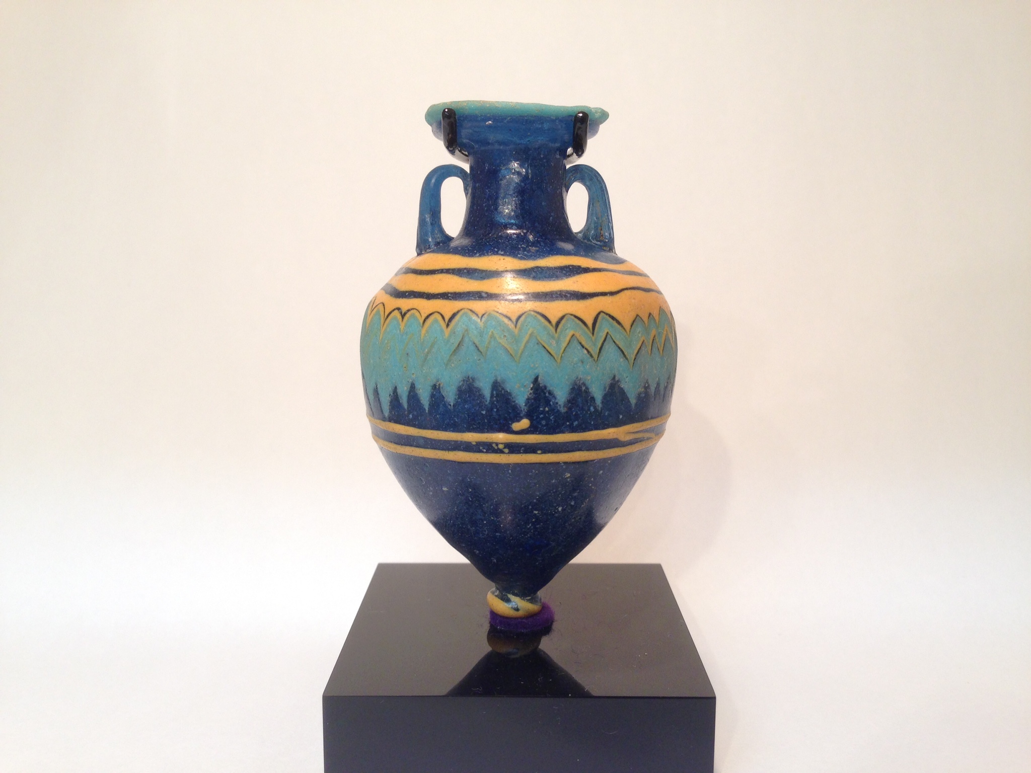 B.C.1世紀にガラスを吹く技術が確立される以前は、鉄製の棒の先に砂などを固め、溶けた棒状の色ガラスを巻き付けて胴体を作り、この胴体の上に紐状の別の色ガラスを巻き付け、とがった棒や刃状の用具で引っ掻いてジグザグなどの文様を出し、その後に口縁部を整え冷やした後、棒を引き抜き中の砂を搔き出すという方法で器が作られていた。「アンフォリスコス」とはギリシャ陶器の「アンフォーラ」を模した形の名称で、このガラスの用途は香油瓶である。肩には螺旋状の線があり、胴体は棒状の用具を上下に動かしたジグザグ文様で、黄色とスカイブルーを丁寧に織り交ぜている。この作品はフェニキアやロードス島で多くの出土例がある。コアガラスの中で、この様にみずみずしい透明感のある状態の良い物は少ない。